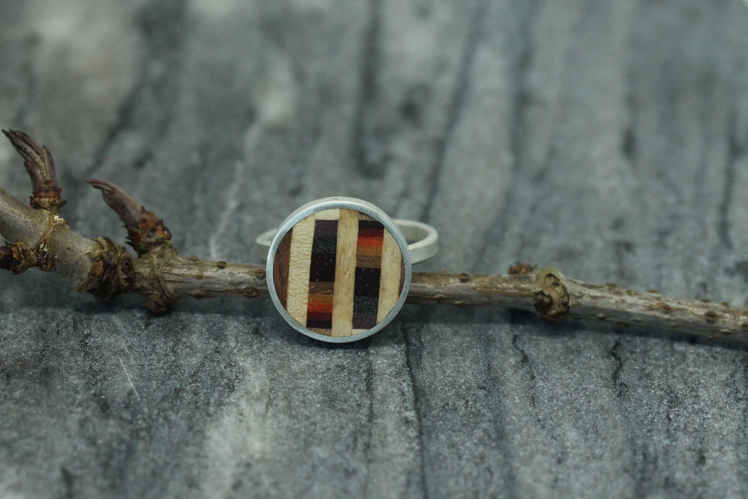 Ring patroon 1Materialen:Sterling zilverInstrumentenhoutDiameter houten inleg: Ringmaat: aanpasbare ringband